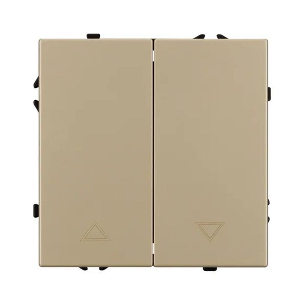 Механизм выключателя управления шторами на 1 пост 2 перекидные клавиши. Цвет - золотой песок, с Soft-Touch покрытием. Без фронтальной рамки. Уровень пылевлагозащиты IP20. Выключатель устанавливается в стандартный круглый подрозетник круглого сечения диаметром 60мм.