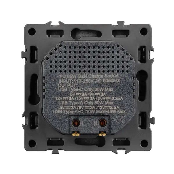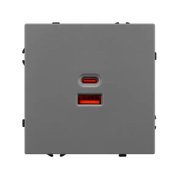 Механизм розетки с быстрой USB зарядкой на 2 порта. Цвет - серый базальт, с Soft-Touch покрытием. Без фронтальной рамки. Уровень пылевлагозащиты IP20. Тип подключаемого разъема - USB Type A + Type C. Устанавливается в стандартный подрозетник круглого сечения диаметром 60мм. Габаритные размеры: длина 71 мм, ширина 71 мм, высота 42 мм. Гарантийный срок 10 лет.