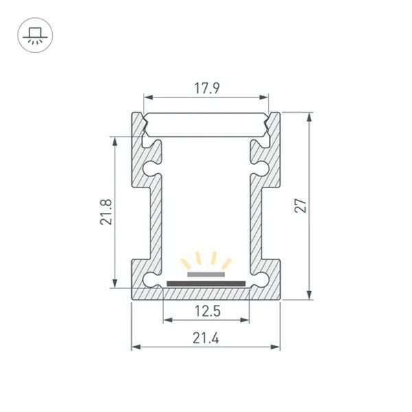 Алюминиевый анодированный профиль. Возможность герметизации до IP65 (при использовании силиконового клея для фиксации экрана и заглушек), IK10 (08-10). Габаритные размеры (L?W?H): 2000x21,4x27 мм. Ширина площадки для ленты 12,5 мм. Заглушки и другие аксессуары приобретаются отдельно. Цена за 1 метр.