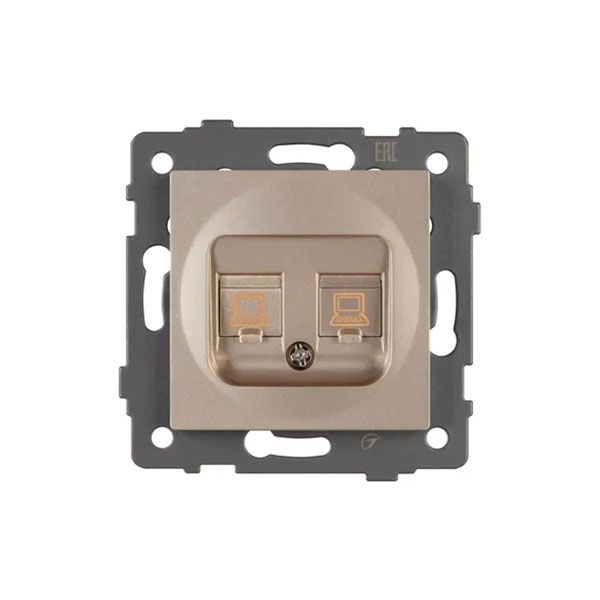 Механизм компьютерной розетки на 2 поста 6-й категории. Цвет - золотой. Без фронтальной рамки. Уровень пылевлагозащиты IP20. Тип подключаемого разъема - RJ45. Розетка устанавливается в стандартный круглый подрозетник.
