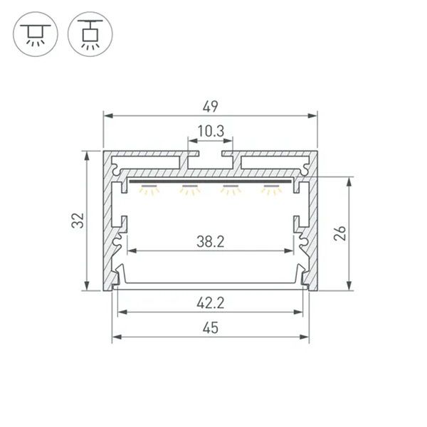 Подвесной/накладной профиль из анодированного алюминия для основной и контурной подсветки помещений. Габаритные размеры профиля составляют 3000 мм в длину, 49 мм в ширину и 32 мм в высоту. Площадка для установки светодиодных лент позволяет использовать ленту шириной до 38,2 мм и мощностью до 42,5 Вт/м. Это обеспечивает гибкость в выборе светодиодных лент и создает потрясающие световые решения.