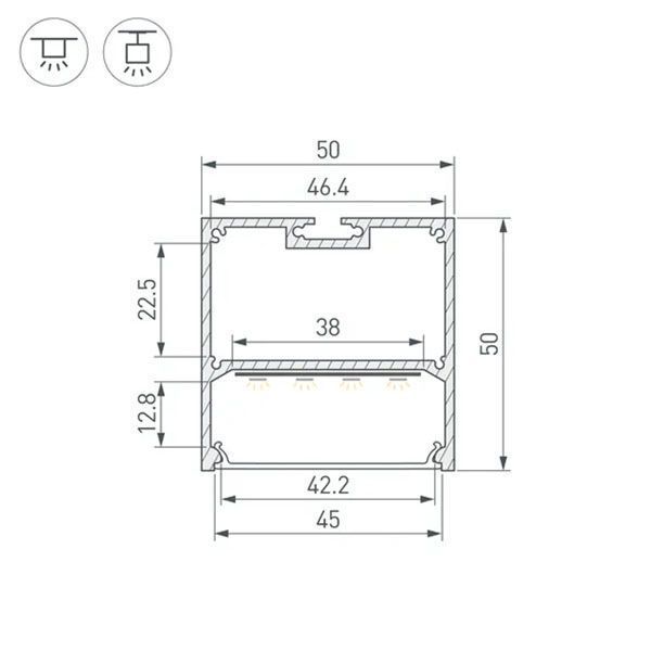 Алюминиевый анодированный профиль для светодиодных лент и линеек. Габаритные размеры (L?W?H): 3000x50x50 мм. Ширина площадки для ленты 38 мм. Отсек для БП 46,4х22,5мм. Экраны, заглушки и другие аксессуары приобретаются отдельно. Цена за 1 метр.
