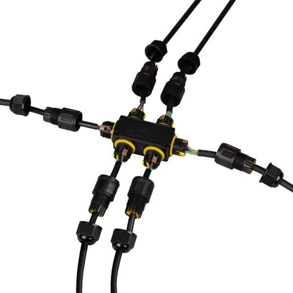 Коннектор пластиковый TT-образный трехконтактный для соединения проводов диаметром 4-8 мм, сечением 0,5-2,5 мм2. Номинальный ток 24 А. Номинальное напряжение 450 В. Цвет черный. Степень защиты IP68. Рабочая температура -40 +100°С. Подключение питания без пайки.