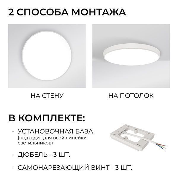 Монтаж осуществляется на универсальную платформу, которая подходит для всех светильников данной серии. Изделие является настенно-потолочным — его можно устанавливать как на горизонтальные, так и на вертикальные поверхности. В комплект поставки включено всё необходимое для монтажа: основание, 3 дюбеля и 3 самореза.