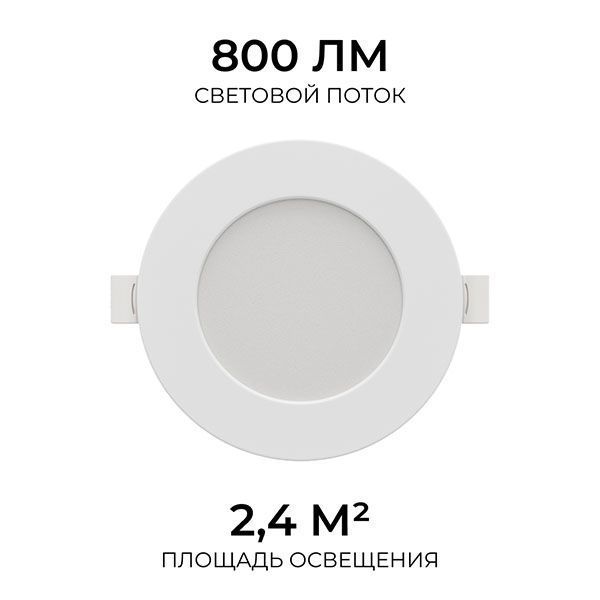 Панель по способу монтажа является встраиваемой, диаметр врезного отверстия — O90-110 мм. Высота изделия составляет 26 мм, вылет над потолочной поверхностью всего 2 мм. Это делает светильник идеальным решением для помещений с низкими потолками. Угол рассеивания света — 120°.