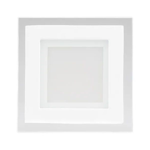 Стеклянная квадратная панель 6Вт / ДНЕВНОЙ 4000-4500K / 430лм / 120°. Размер 96x96x40мм (в отверстие 75x75мм). Корпус белый. Питание от сети 230VAC, драйвер в комлекте 300mA 15-25V. Диапазон рабочих температур -10°..+40°C. Для помещений.