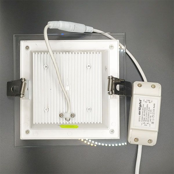 Стеклянная квадратная панель 12Вт / БЕЛЫЙ 5500-6000K / 950лм / 120°. Размер 160x160x45мм (в отверстие 125x125мм). Корпус белый. Питание от сети AC 230V, драйвер в к-те 300mA 25-45V. Для использования с диммерами TRIAC замените драйвер на ARJ-LK48320-DIM (приобретается отдельно). Для помещений.